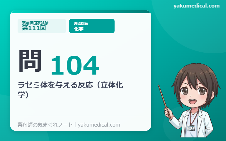【第111回薬剤師国家試験】問104 ラセミ体を与える反応(立体化学) 解説