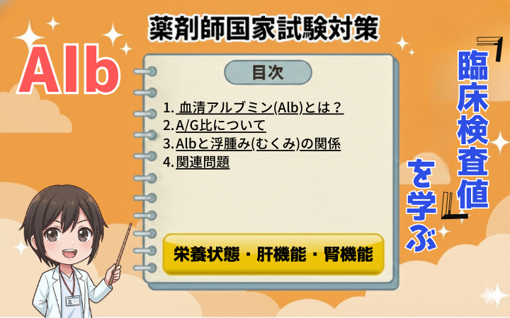 この記事では、臨床検査値の血清アルブミン(Alb)についてまとめていきます!
