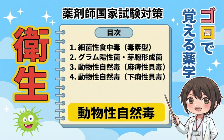 今回は、薬剤師国家試験対策として衛生で使える動物性自然毒のゴロをご紹介しました。