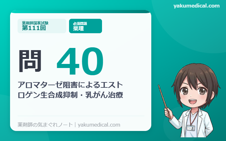 【第111回薬剤師国家試験】問40 アロマターゼ阻害によるエストロゲン生合成抑制・乳がん治療薬 解説