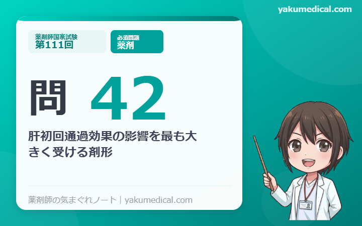 【第111回薬剤師国家試験】問42 肝初回通過効果の影響を最も大きく受ける剤形 解説