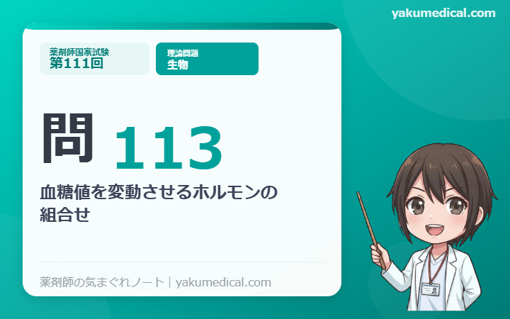 問113 血糖値を変動させるホルモンの「名称 — 産生器官 — 血糖値の変動」の組合せとして、正しいのはどれか。2つ選べ。