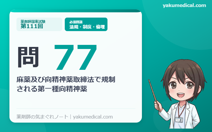・選択肢4(メタンフェタミン)は覚醒剤取締法の規制対象であり、麻向法の向精神薬ではない点に注意