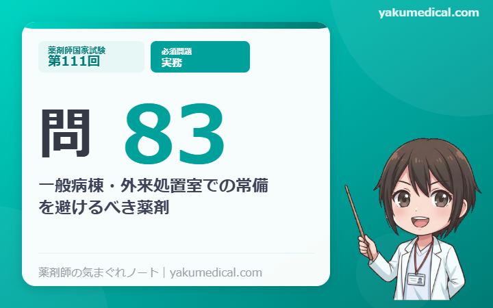 ・選択肢1(リドカイン静注用 2%)も過量投与で中毒(痙攣・心停止)リスクがあるが、一般病棟よりも救急カート・処置室での常備が前提となっており、本問の「最も避けるべき」には該当しない