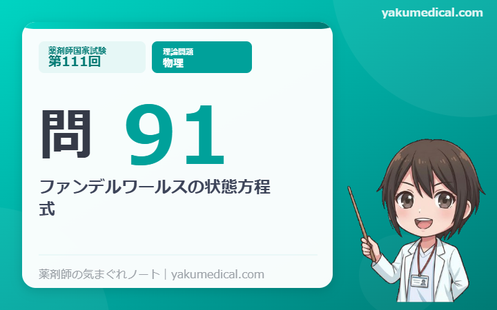 実在気体の挙動は高圧・低温ほど理想気体からずれが大きくなります。これは薬学的には医薬品ガス(窒素、二酸化炭素など)の取り扱いや、高圧ガス充填製剤の設計にも関係する概念です。国試では「$a$が何の補正か・$b$が何の補正か」を正確に押さえることが重要です。
