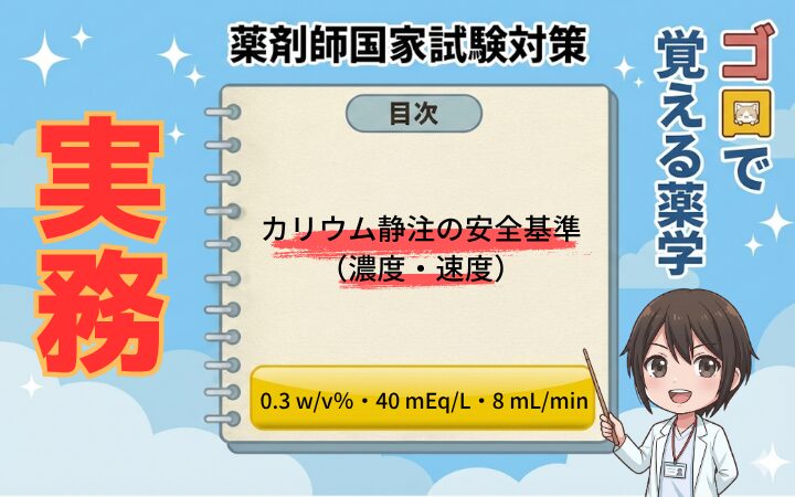 今回は、薬剤師国家試験対策として「実務」の範囲で使えるカリウム静注の安全基準(濃度・速度)のゴロをご紹介しました。