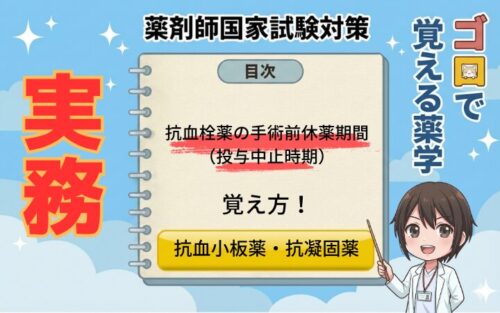 今回は、薬剤師国家試験対策として実務の範囲で使える抗血栓薬の手術前休薬期間(投与中止時期)のゴロをご紹介しました。